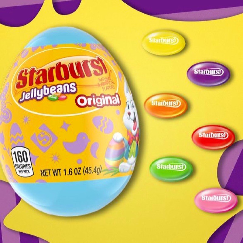 STARBURST Original Easter Jellybeans Candy Bag, 14 oz STARBURST Jellybeans is a burst of juicy flavor in a whole new form. WHERE TO BUY Nutrition Serving Size 1 oz. (28g/about 20 pieces) Servings Per Container about 14 Amount per serving % Daily value Calories 100 Total Fat 0 g 0% Saturated Fat 0 g 0% Sodium 5 mg 0% Total Carbohydrate 25 g 9% Total Sugars 20 g Includes Added Sugars 20 g 40% Protein