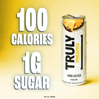 Nutrition | Truly Hard Seltzer | Truly Hard Seltzer Less is more — especially when it comes to calories. All 12oz cans of Truly have under 110, which means plenty of refreshing flavor that won't weigh you down. Lower Sugar Every Truly (yes, including Extra) contains only 1g of sugar. For such a low-sugar sentiment, this sure feels sweet. Not Artificial We like to keep it real around here.