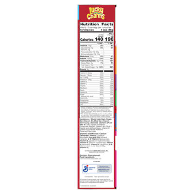 General Mills Lucky Charms Cereal Family Size - Giant Food Stores Per 1 Cup Serving: 140 calories; 0 g sat fat (0% DV); 230 mg sodium (10% DV); 12 g total sugars. Gluten Free. 19 g whole grain per serving at least 48 g ...